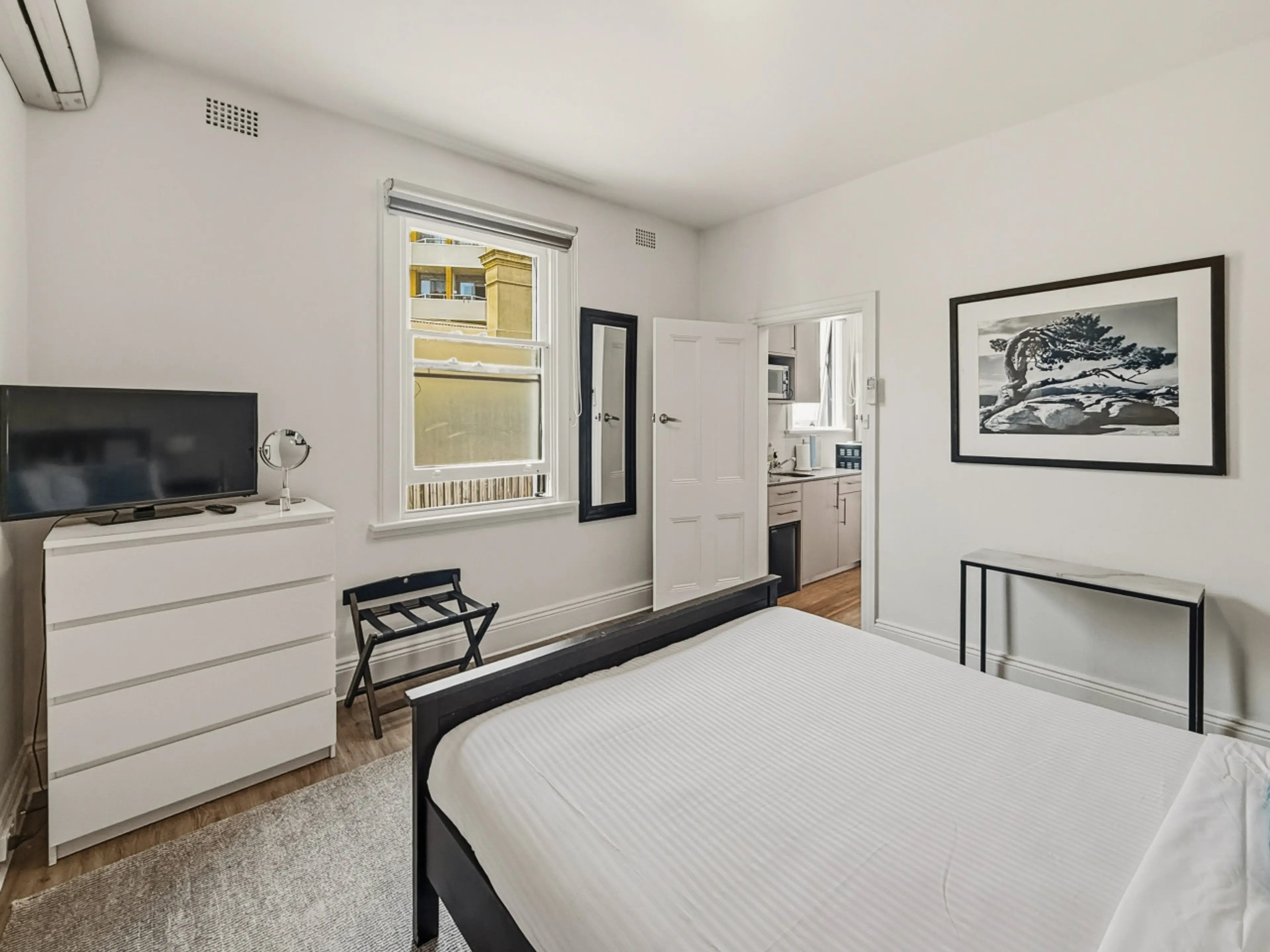 This newly renovated apartment has everything for a comfortable stay. A cozy space with a separate bedroom featuring AC and heating, plus a kitchenette and lounge area with dining table. The bathroom is large and modern, with luxury Leif toiletries and a huge walk-in closet. We’ve provided all you m...